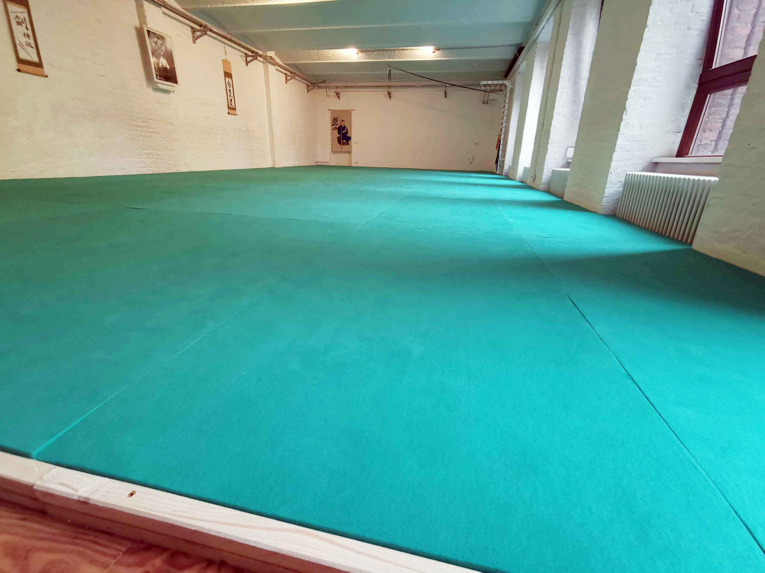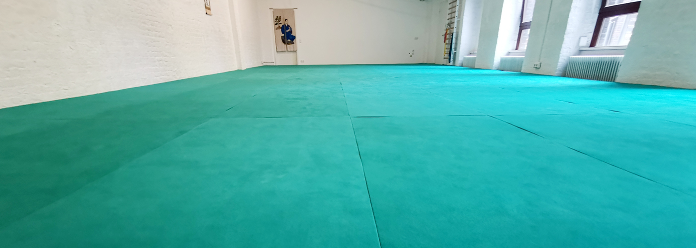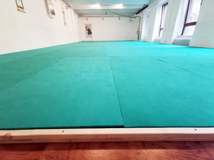 Zentrum des Selbstverteidigung Dojo Berlin ist die große Übungsmatte, die auch in vollen Stunden genug Platz für ein angenehmes und sicheres Training bietet.